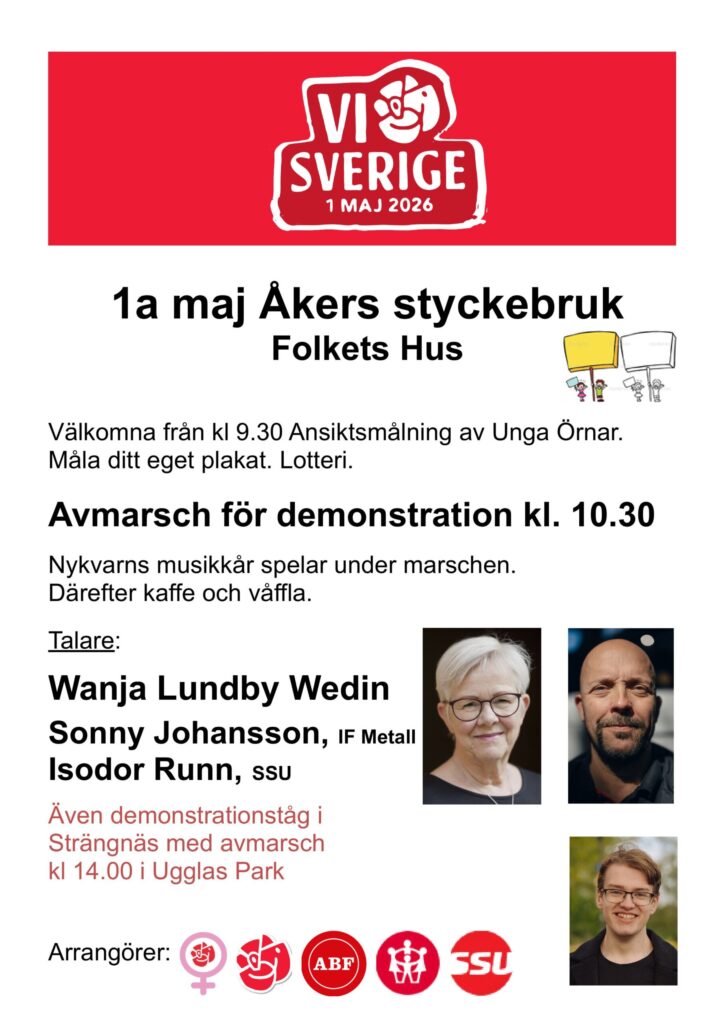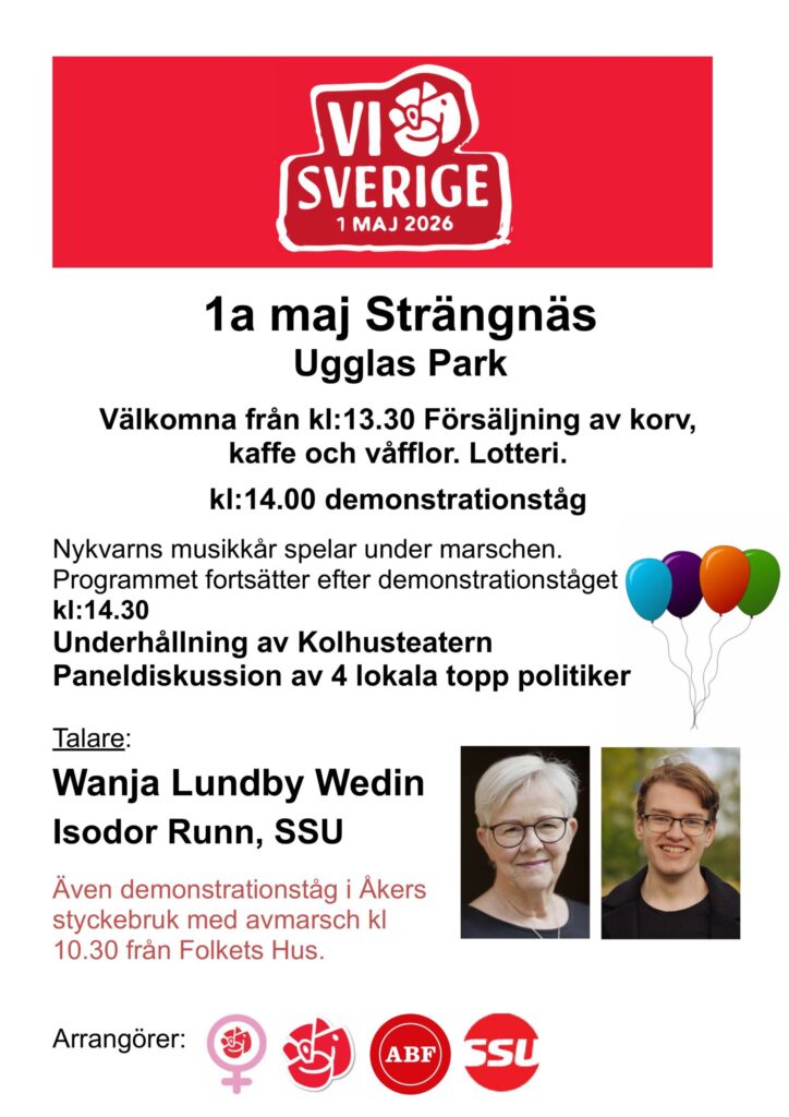 Massor av aktiviteter. 1:a maj tåg med orkester, tal av Wanja Lundby Wedin, SSU, fackliga representanter. Kaffe, korv,, lotteri. Sång av Kolhusteatern i Strängnäs, intervju med våra första namn på kommunfullmäktige listan.